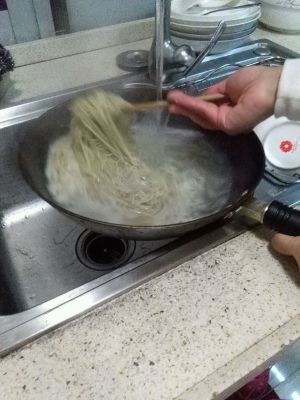 接着把面条放在油里。