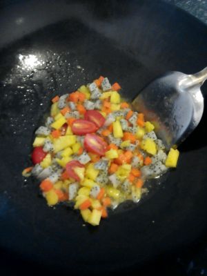锅里下去少许油,先放红萝卜炸下,然后放其它水果。