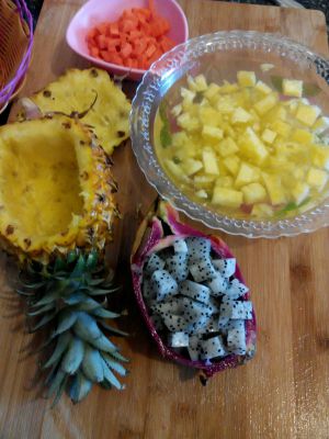菠萝肉挖出来切块,用盐水浸泡。火龙果切块,红萝卜切丁。