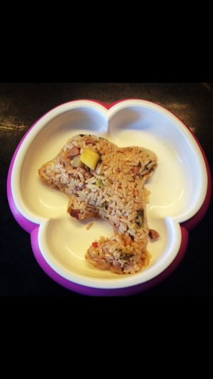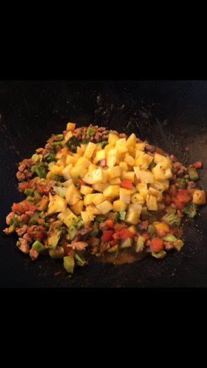 米饭倒入锅内翻炒,如果太干,倒点菠萝汁。