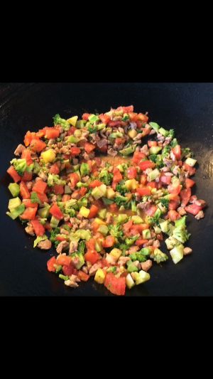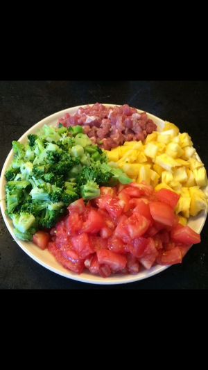 菠萝泡盐水后切丁 西红柿去皮切丁 西兰花热水过一下切丁 猪肉解冻切丁 还要泡一下虾皮 忘记拍了