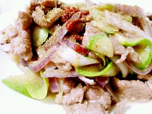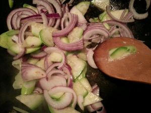 葱蒜呛锅,放入西葫芦断生放入洋葱,羊肉,料酒,盐,生抽少许,孜然翻炒