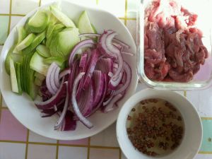 准备食材,西葫芦切片,羊肉切片,洋葱切丝,泡花椒水