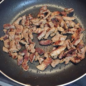 倒掉汤汁,大火继续炒至发黄后盛出
