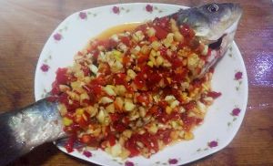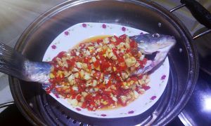 自制的剁椒酱,放上蒜粒、白砂糖拌匀,铺在鱼身上,放热水里蒸制10分钟。