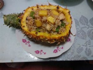 把弄好的饭放到菠萝里,我买的菠萝小,八宝饭是350g的,刚刚好!