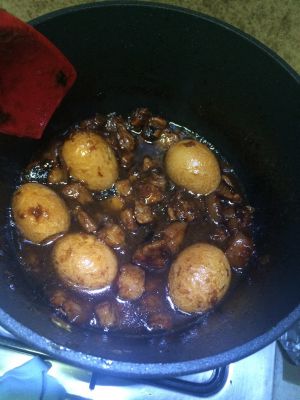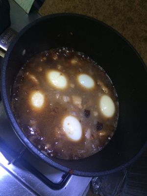 等肉肉变成浅咖啡色后,加入白煮蛋,加入少许水至莫过肉肉,直到翻滚,随后将大火改为小火,慢慢煮40到60分钟!中间需少许翻炒一下,以免粘锅!