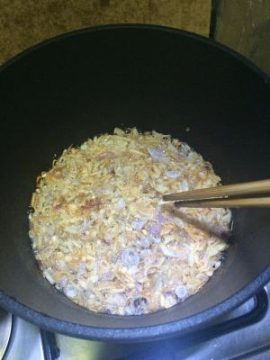 留一勺左右炸油葱酥的油在锅中,依次加入蒜,八角,洋葱,虾米,炒至洋葱透明。注意油不要放很多哦,因为之后五花肉会煮出很多油呢!