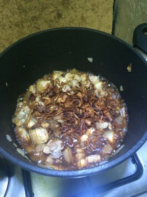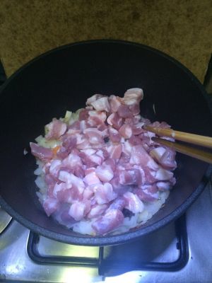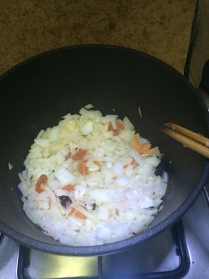 五花肉切小块,放进锅里翻炒出油,下水发的干香菇炒香,下炒好的红洋葱