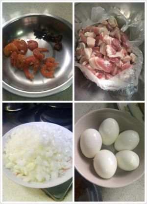五花肉切小丁,洋葱切丁备用!煮五个白煮蛋,虾米是为了提鲜,可以切碎一点,也可以整个放进去。这里特地说一下,一定要选五花肉而不是肉丁哦,五花肉煮久后口感更好,而肉丁肉丝搅的太碎会做的很口很柴柴的!