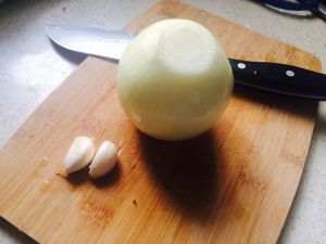 洋葱切丁,两片蒜瓣切小块!这里特地选了黄洋葱,和紫色洋葱比口感更甜一些。