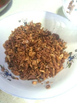 自制红葱头酥:将图片所示的红葱头去外皮、洗净、滤干、切碎,均匀拌一些面粉,入油锅炸脆,捞起控干油后,碾碎即成。
