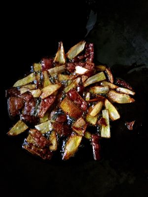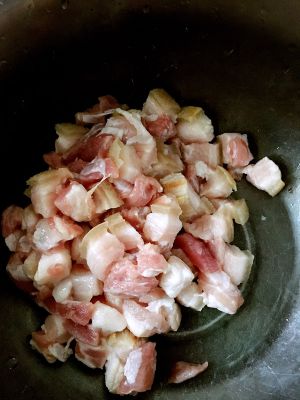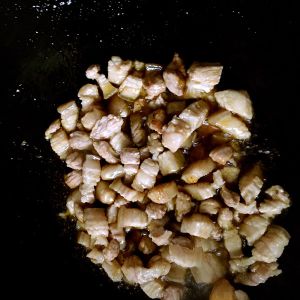 锅内放少许油,下五花肉丁慢慢煸炒至焦黄色