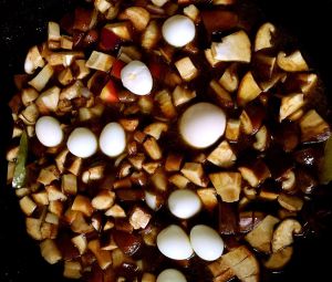 所有食材洗干净,五花肉切细条状,洋葱切块,干香菇泡发切丁(香菇水留着),鸡蛋煮熟去壳