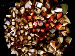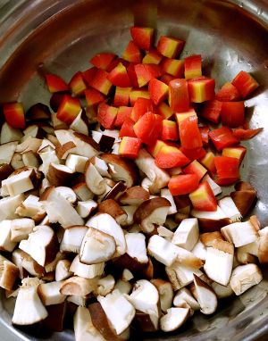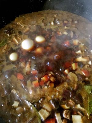 加入香菇丁,胡萝卜丁,八角,桂皮,香叶,生抽,老抽,加水至淹过所有食材,大火煮沸。