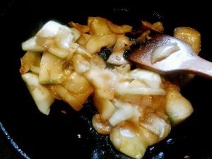 茄子去皮,片成大块的薄片,按道理茄子皮很有营养,可孩子不太喜欢,也就去掉了。然后放少许底油,倒入茄子,翻炒至脱水,变软,有的人煸茄子放好多油,其实不需要,茄子出汤,一点油就好
