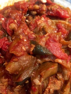 锅内放少许油,放葱末炒香后放五花肉片,煸出油后倒入西红柿,翻炒至断生后➕老抽、生抽、糖适量继续翻炒均匀后倒入茄子,继续翻炒至茄子包裹上西红柿汤汁,关火后姜蒜末放入锅中搅拌均匀,即可出锅!