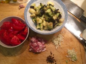 圆茄子切滚刀块➕盐腌一会儿,大概15分钟后挤出水分待用