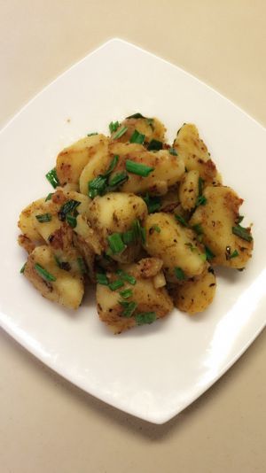2,锅里油热放入蒜粒少许炒香,下入土豆块,放少许辣椒面,盐,白糖一点,几点麻油,翻炒10秒左右撒上葱花或蒜苗粒,撒上孜然炒均匀即可起锅味道扛扛的