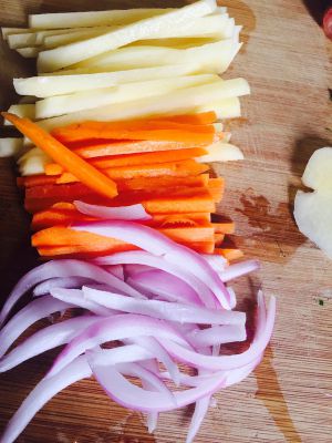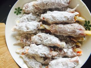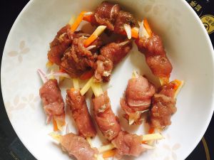 将准备好的里脊肉片与土豆条,胡萝卜条,圆葱条卷成排骨状。
