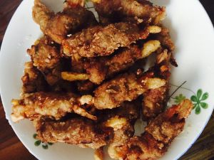 放置油锅炸至金黄,温度不要过高,时间稍微久一点,避免里脊肉内部不熟。