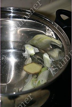 排骨用开水焯一下撇去浮沫,捞出备用;另取一锅中放入清水、葱、姜、蒜,大火煮开;