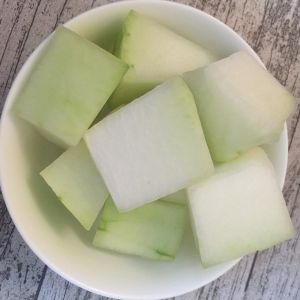 排骨焯水,薏米洗净,冬瓜洗净切成宽条(不要去皮)带皮才好