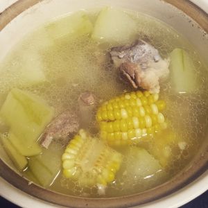 煲里放适量水烧开把排骨,玉米,胡萝卜和汤料放入,大火煲开10分钟后转小火煲45分钟~