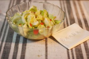 将糖醋汁倒入锅中,翻炒,倒入适量盐、蚝油、鸡粉翻炒出锅。注意火候,不要炒太久,保持包菜的黄绿色泽。