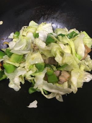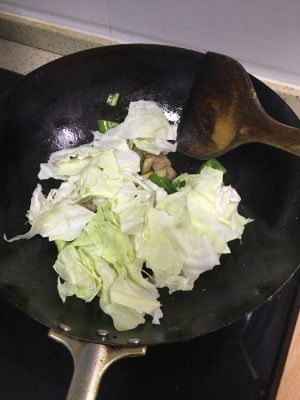 接着放入撕好的包菜,掂锅翻炒(尽量避免用铲子,这样一来使包菜受热均匀,二来形不破坏包菜叶)
