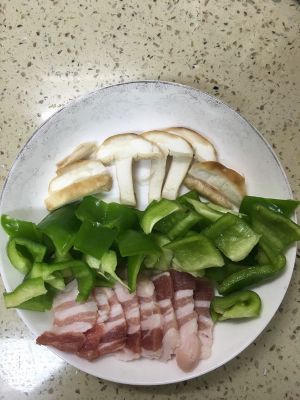 香菇切片,青椒切块,五花肉切片