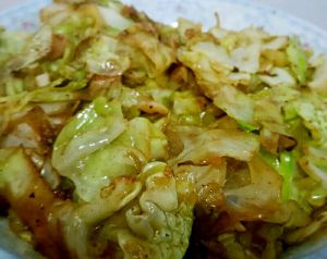 包菜炒熟后加入适量盐,半瓶盖酱油,半瓶盖陈醋,翻炒一分钟