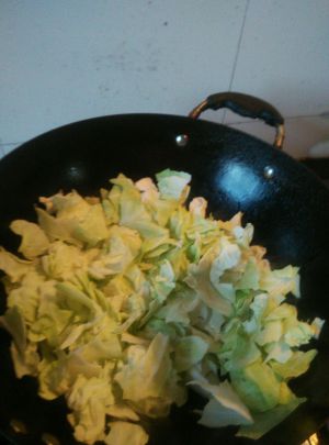 把圆白菜翻炒几分钟,看到白菜的量变成生菜时的1\2的量就基本熟透了。放入盐出锅。