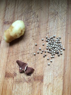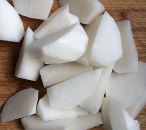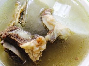 木瓜去皮、去籽后切成和排骨大小差不多的木瓜条。排骨炖大约一个半小时后,将木瓜放入锅中继续炖45分钟。