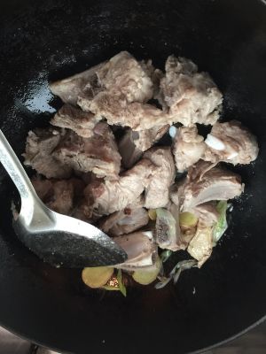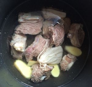 重新倒入凉水,放入姜片和柠檬片,以及排骨。中火烧开后,即捞出柠檬(不然,时间长会有苦味了),然后转小火慢炖。