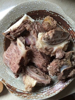 牛排骨买回,和冷水一起下锅煮十分钟,然后捞起洗净备用