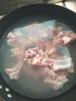 锅烧热水,下入排骨和姜片,大火烧沸转中小火熬煮1小时左右