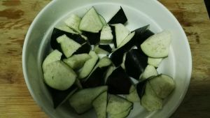 茄子切成块,泡在水里待用(泡在水里不会变色)