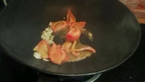番茄去蒂后如图切成块状、大蒜切末备用。
