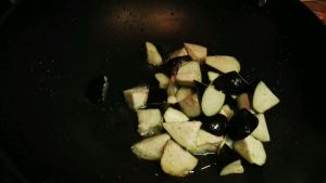 放入食盐、生抽继续翻炒,待茄子将锅中的油全部吸入,茄子块边缘变软时。