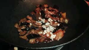 待茄子完全变软后,放入蒜末翻炒均匀。