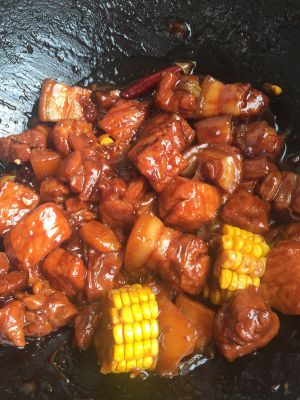 然后开中火加5勺酱油,汤汁不能没过肉的时候加入6勺糖,转大火炒,汤汁快没的时候就可以出锅了,然后就是这个样子了