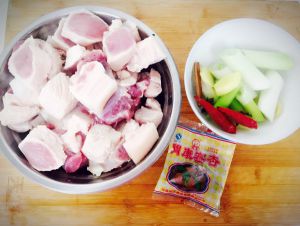 将肉块在热水里煮5分钟,捞出放入凉水盆冲凉,捞出备用!
