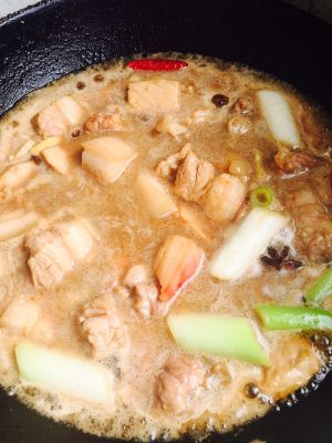 葱用油爆香,然后倒入肉,翻炒至表面略焦黄,加入大量的水,我加了高出肉2倍的水,加入料酒,生抽,老抽,冰糖