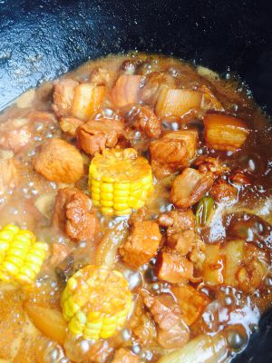 锅内加入莫过肉块的热水,放入所有辅料,适当加入酱油提色和适量盐,搅拌均匀后转大火烧开水,转中火盖上盖子,煮40分钟左右!(如果想放玉米和鸡蛋的朋友,这时放进去一起炖)