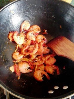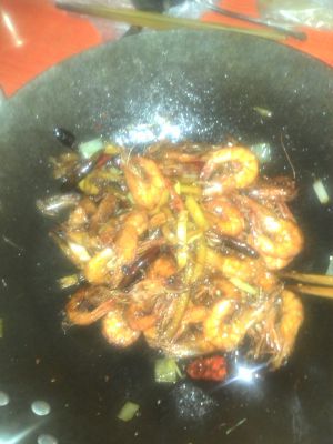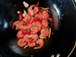 锅内留少许油,放葱姜,花椒,辣椒,爆出香味后,倒入虾翻炒几下,倒入生抽,白糖,再次翻炒。
