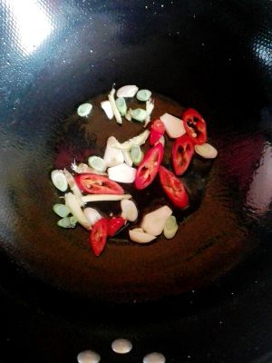 起锅,倒入少许油,倒入葱,姜,蒜,辣椒,煸炒出香味