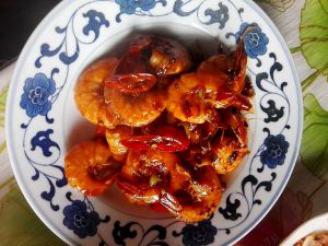 炸酥大虾,虾最好要活的。用料酒,生抽腌制五分钟后煎酥即可!