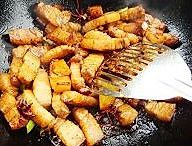 锅里放油,七成热时放入冰糖,小火炒出糖色,放入五花肉,翻炒上色