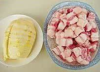 分别将竹笋和五花肉焯烫一下,焯好后捞出备用。